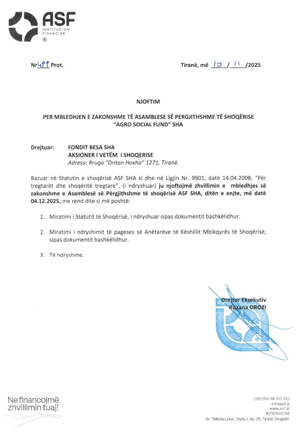 10 Nëntor 2025 10 Nëntor 2025Asambleja e përgjithshme e shoqërisë Agro Social Fund SHA Asambleja e përgjithshme e shoqërisë Agro Social Fund SHA